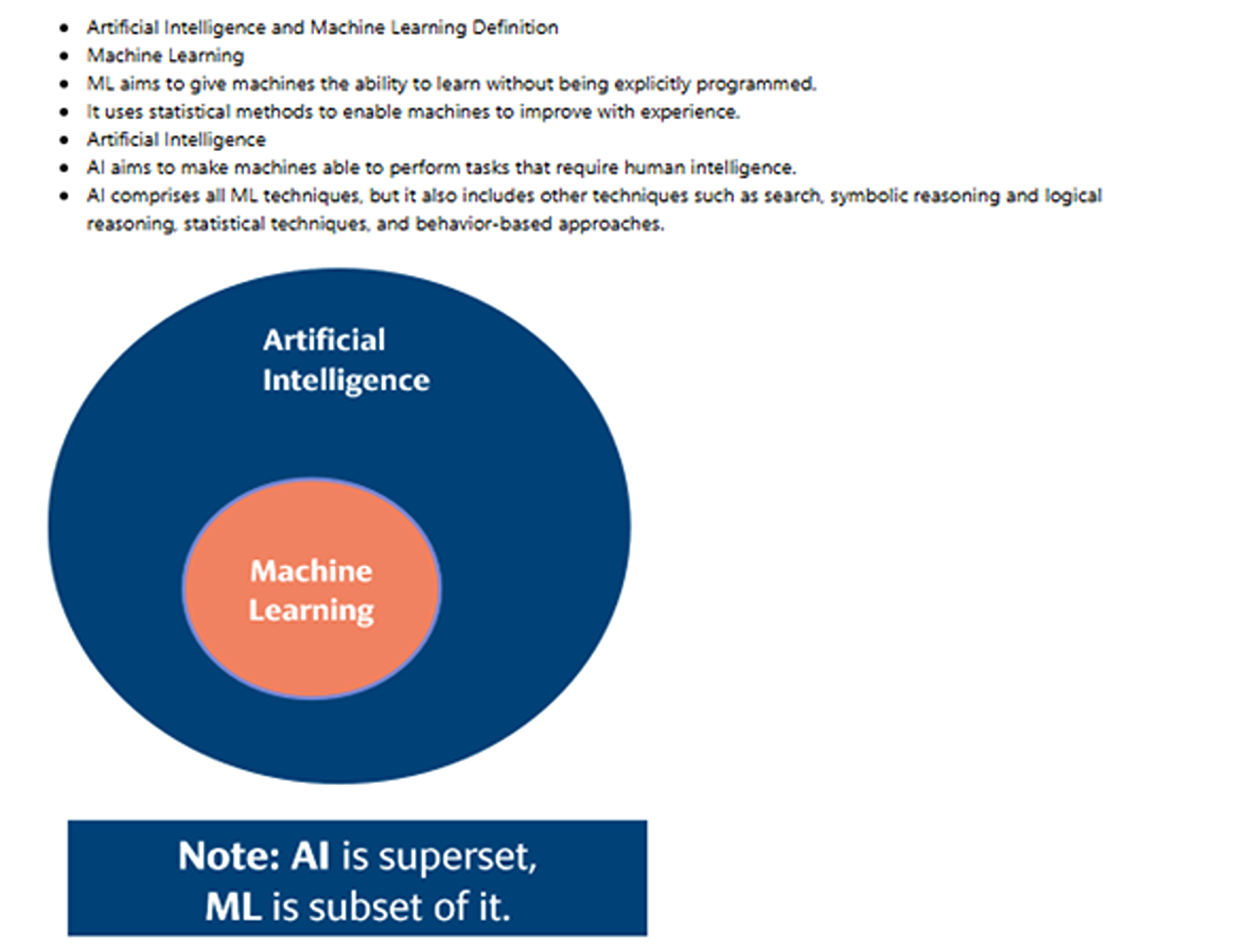 La IA tiene como objetivo hacer que las máquinas sean capaces de realizar tareas que requieran inteligencia humana. La IA es un superconjunto, el ML es un subconjunto. La IA comprende todas las técnicas de ML, pero también incluye otras técnicas como la búsqueda, el razonamiento simbólico y el razonamiento lógico, las técnicas estadísticas y los enfoques basados en el comportamiento.