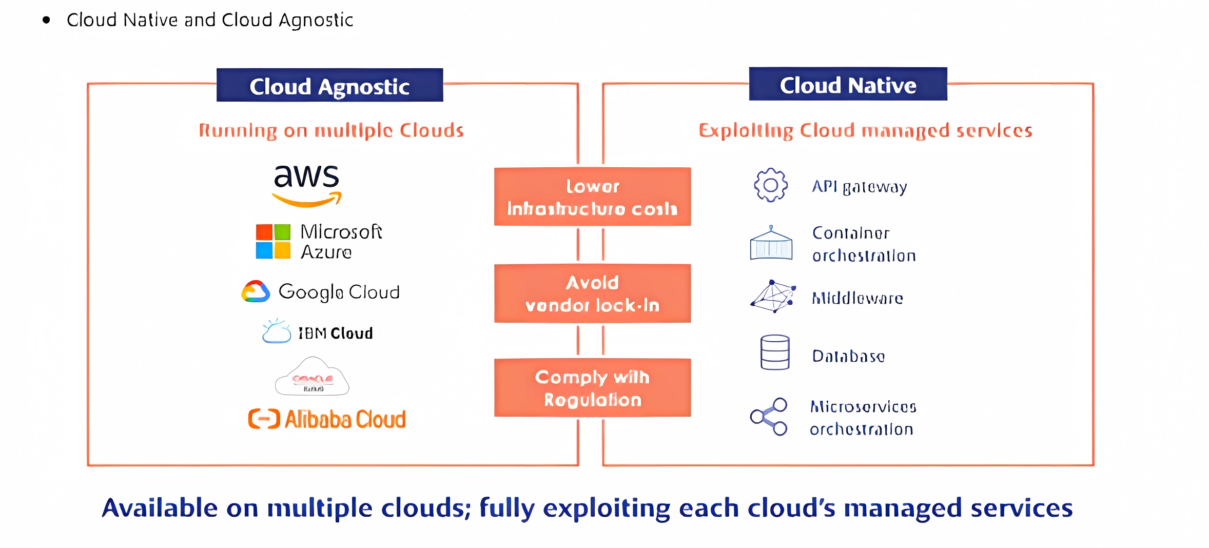 La diapositiva destaca la diferencia entre los enfoques agnósticos y nativos de la nube, haciendo hincapié en los beneficios y servicios asociados con cada modelo.