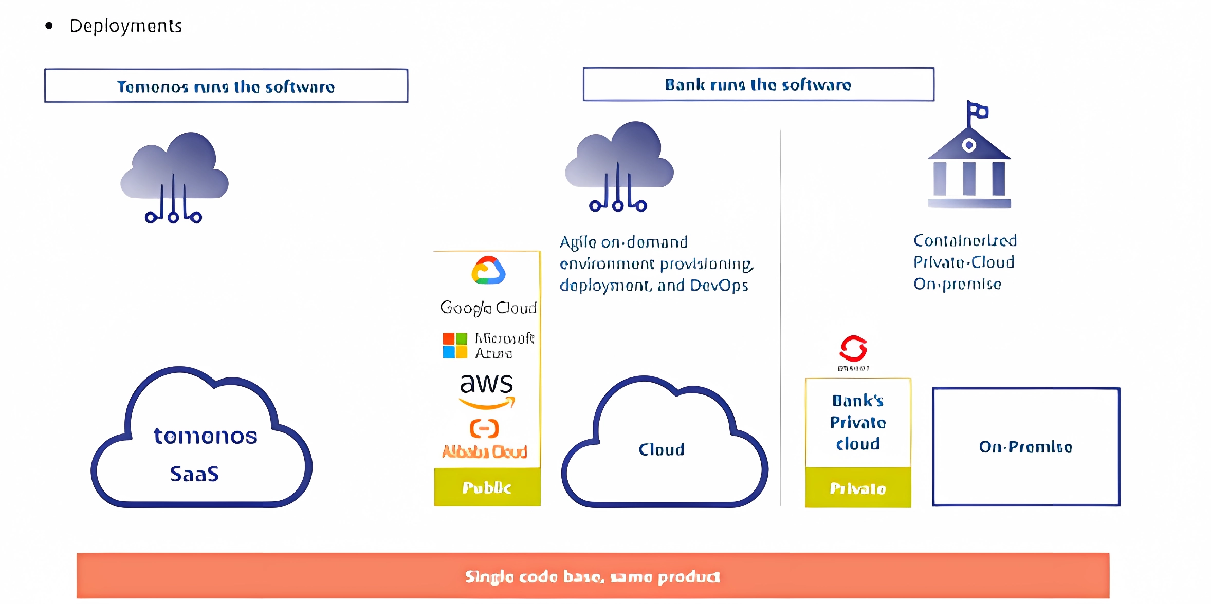 Por supuesto, los bancos también pueden seguir siguiendo la forma tradicional de ejecutar su software en las instalaciones. Independientemente de cómo se implemente el software de Temenos, opera con el mismo código y base de configuración en los tres entornos. En otras palabras, el software de Temenos es independiente de la implementación.