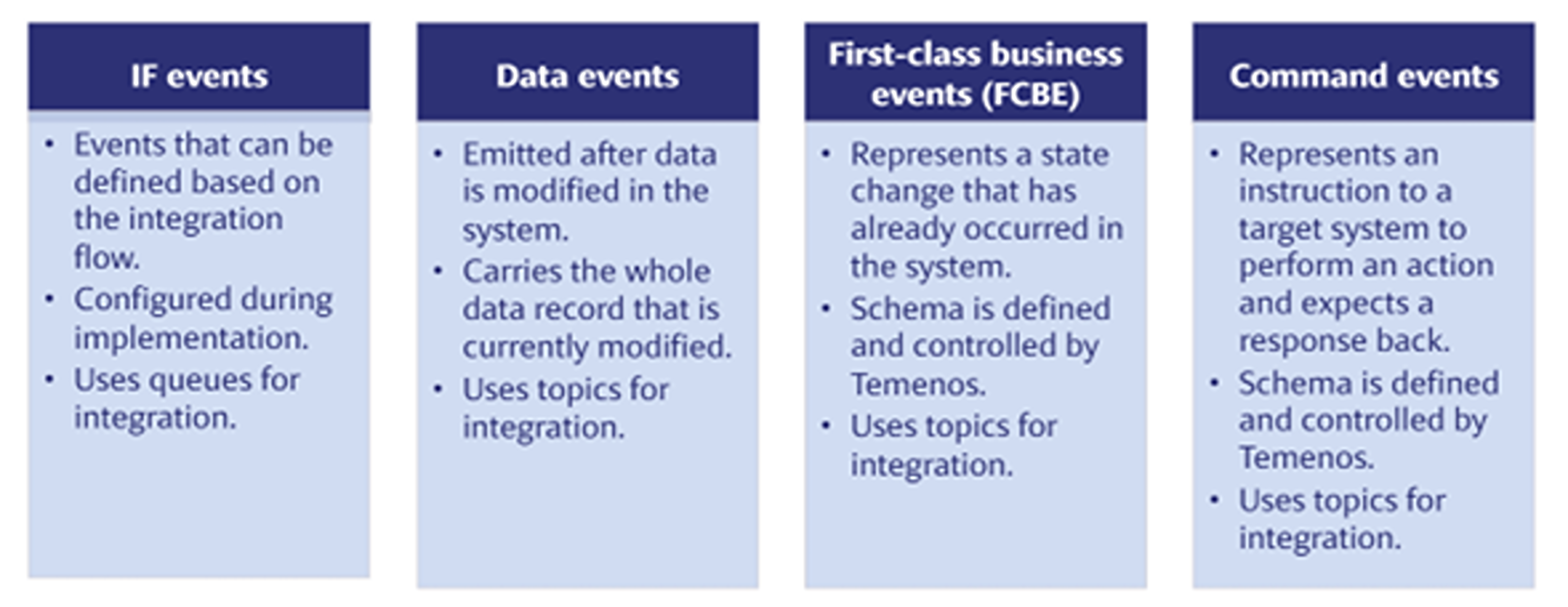 La imagen describe cuatro tipos de eventos utilizados en los sistemas de Temenos para administrar e integrar diversas operaciones.