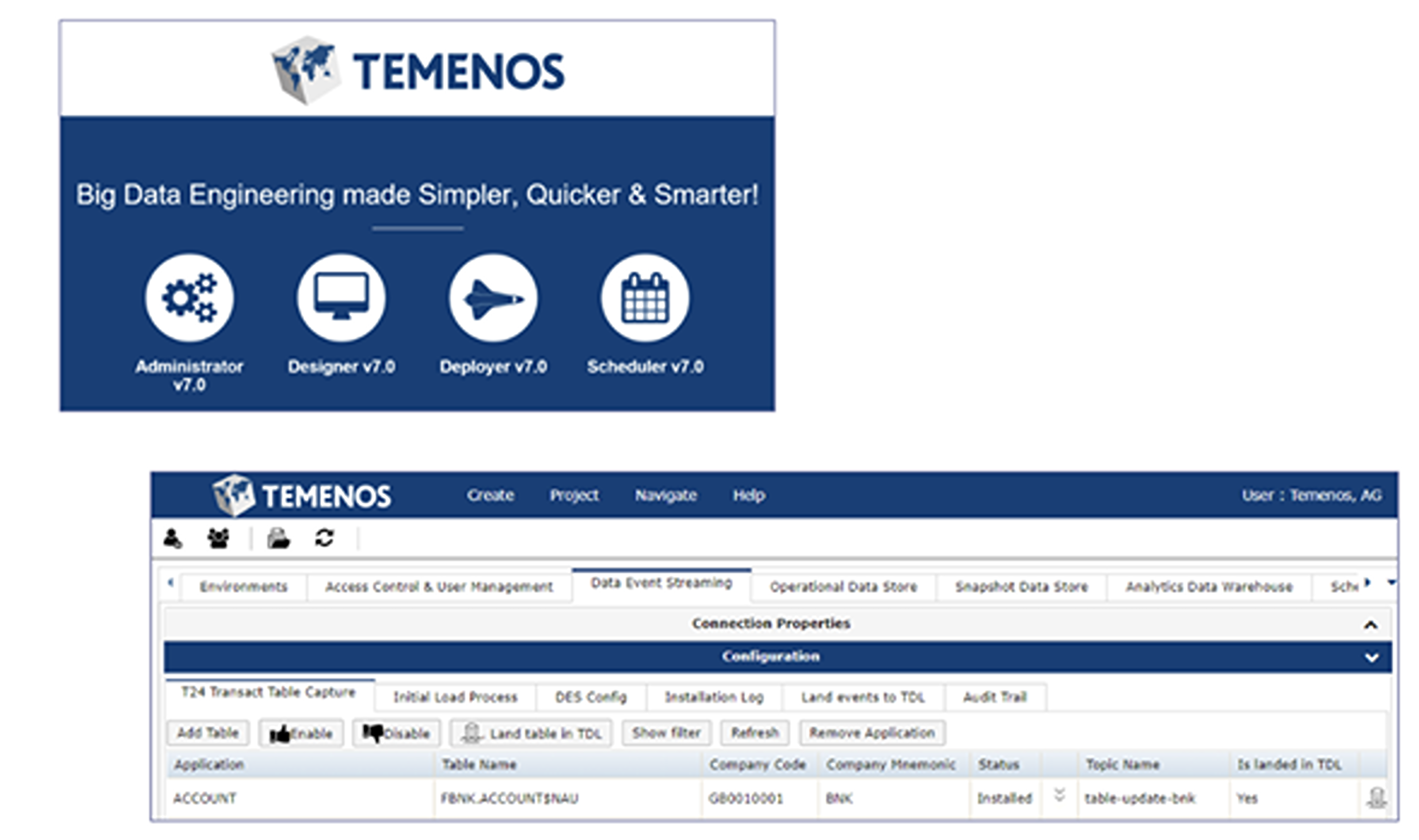 Lo que está viendo es la pantalla de inicio de la interfaz de usuario web de Transact Data Hub. Puede ver una única interfaz de usuario para todos los roles, como administrador, diseñador, implementador y programador.