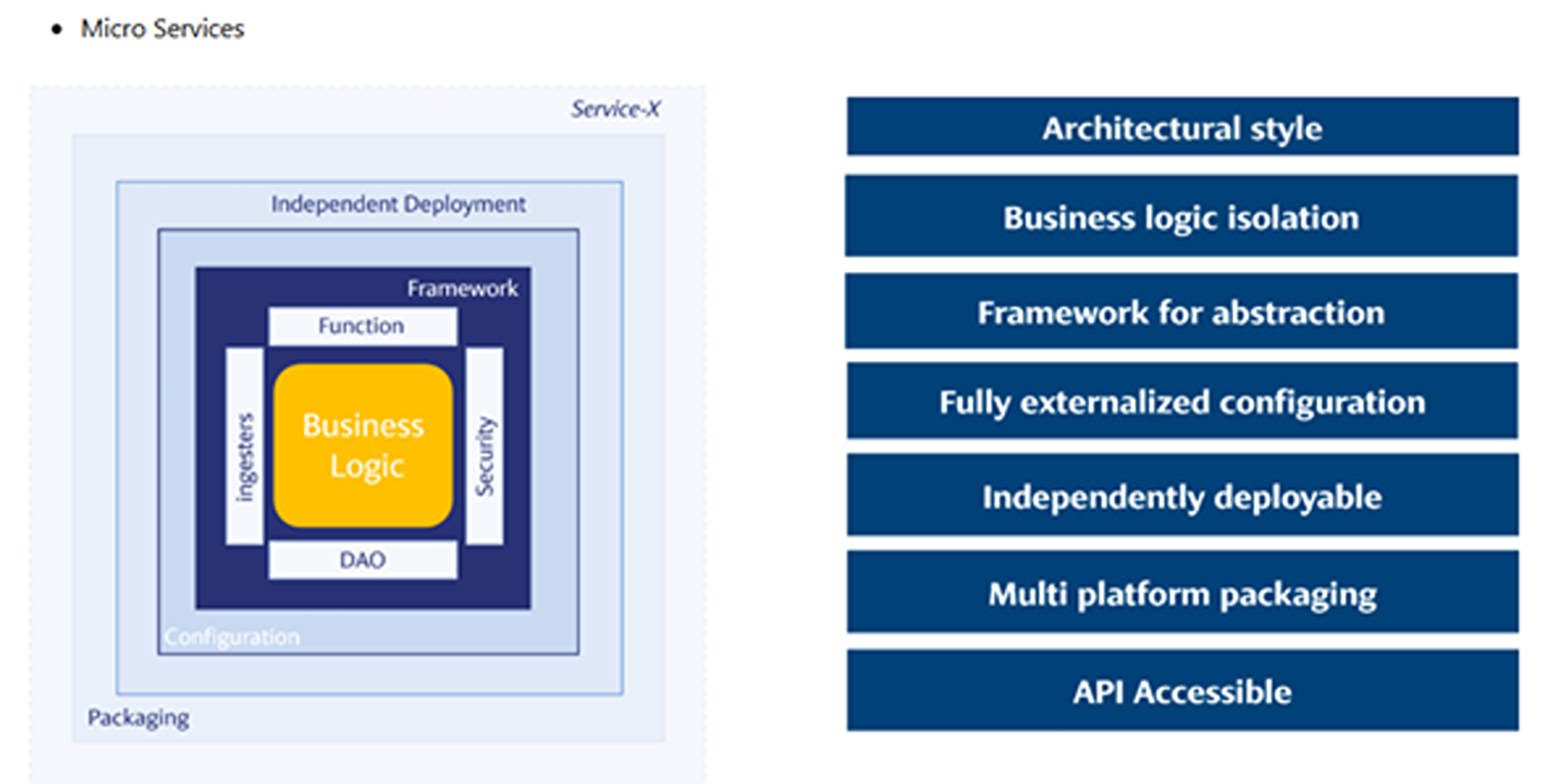 La solución para eso son los microservicios. Esto es lo que utilizan Uber, Amazon, Netflix, etc., para gestionar sus usuarios y cargas. Es un estilo arquitectónico. Como su nombre indica, cada servicio tiene una lógica específica, en su mayoría servicios reutilizables orientados a los negocios, por ejemplo, Holdings, para obtener una lista de todos los datos de una cuenta. No hace nada más y solo tiene una lógica de negocio. Está completamente abstraído y, por lo tanto, el sistema de llamada lo trata como una caja negra. Todos los configurables están externalizados, incluida la exposición de puertos, y esto lo hace muy amigable para los equipos de implementación que trabajan en proyectos grandes.