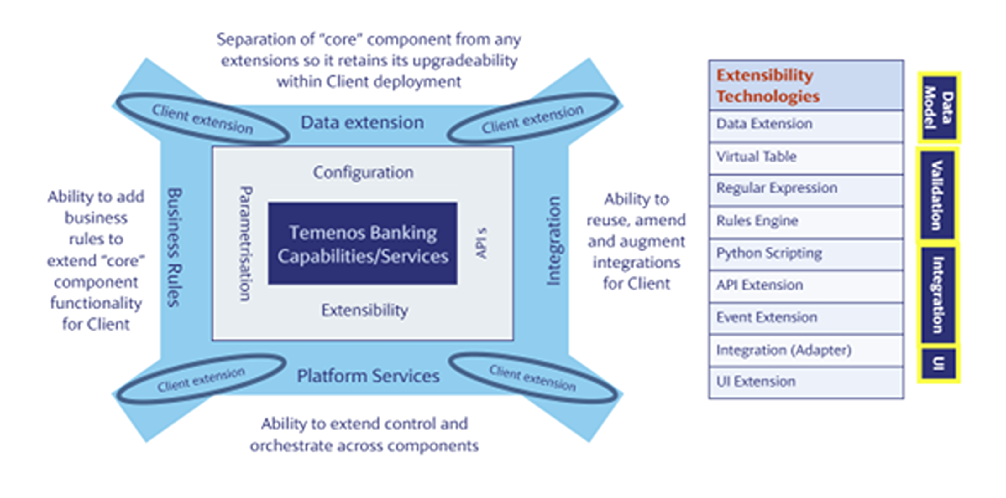 Proporciona un mecanismo de extensión unificado para todos los productos de Temenos como Retail, Corporate, Payments, Wealth, etc., a través de una herramienta de configuración de diseño común.