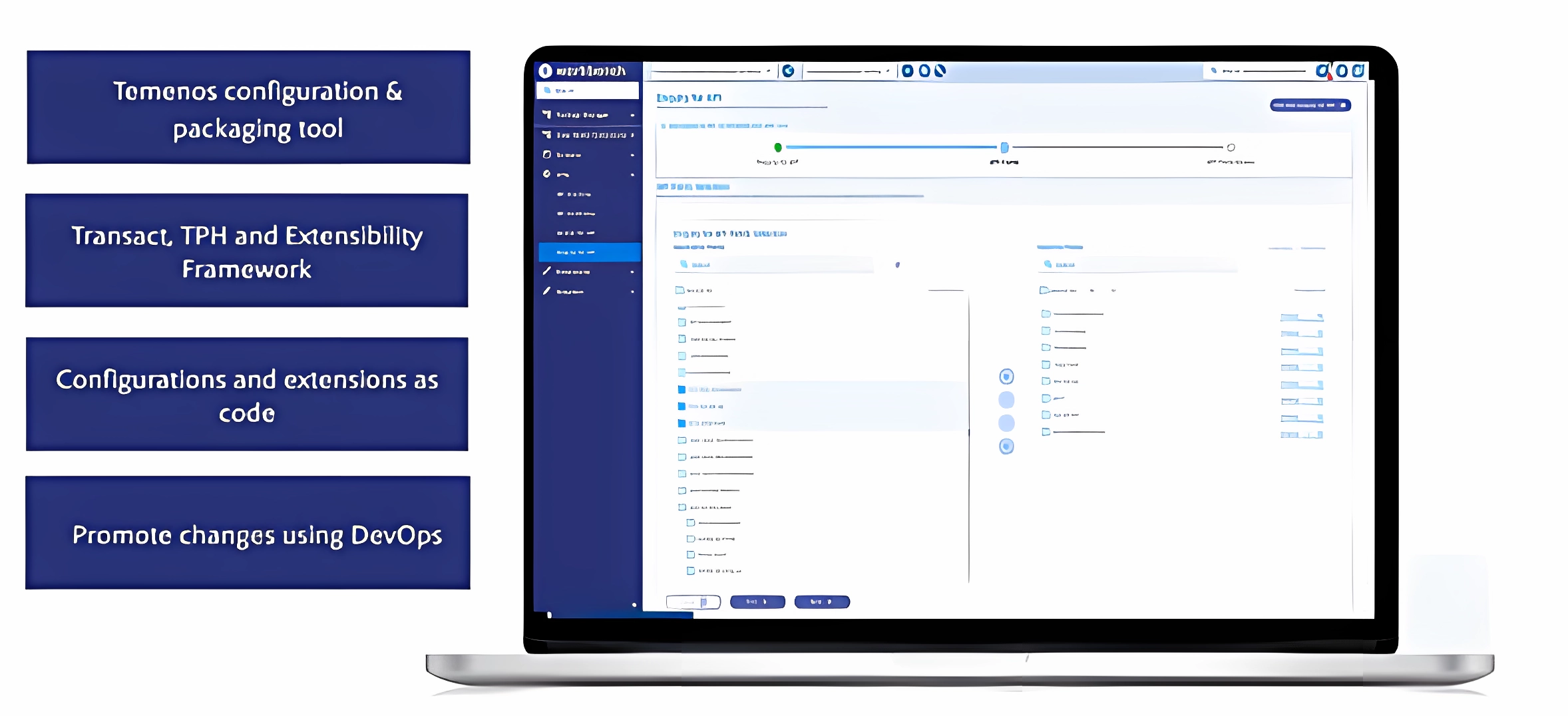 Transact Workbench es su solución de referencia para todas estas necesidades. Una de las características más destacadas de Transact Workbench es su solución de empaquetado avanzada y sencilla. Esta característica le permite empaquetar y promover cambios sin esfuerzo, trabajando sin problemas con cualquier solución DevOps estándar de la industria, incluida la implementación continua propia de Temenos. Esto significa que puede administrar la configuración como código, aplicando las mismas metodologías avanzadas del ciclo de vida de desarrollo de software que se utilizan en la programación a la configuración.