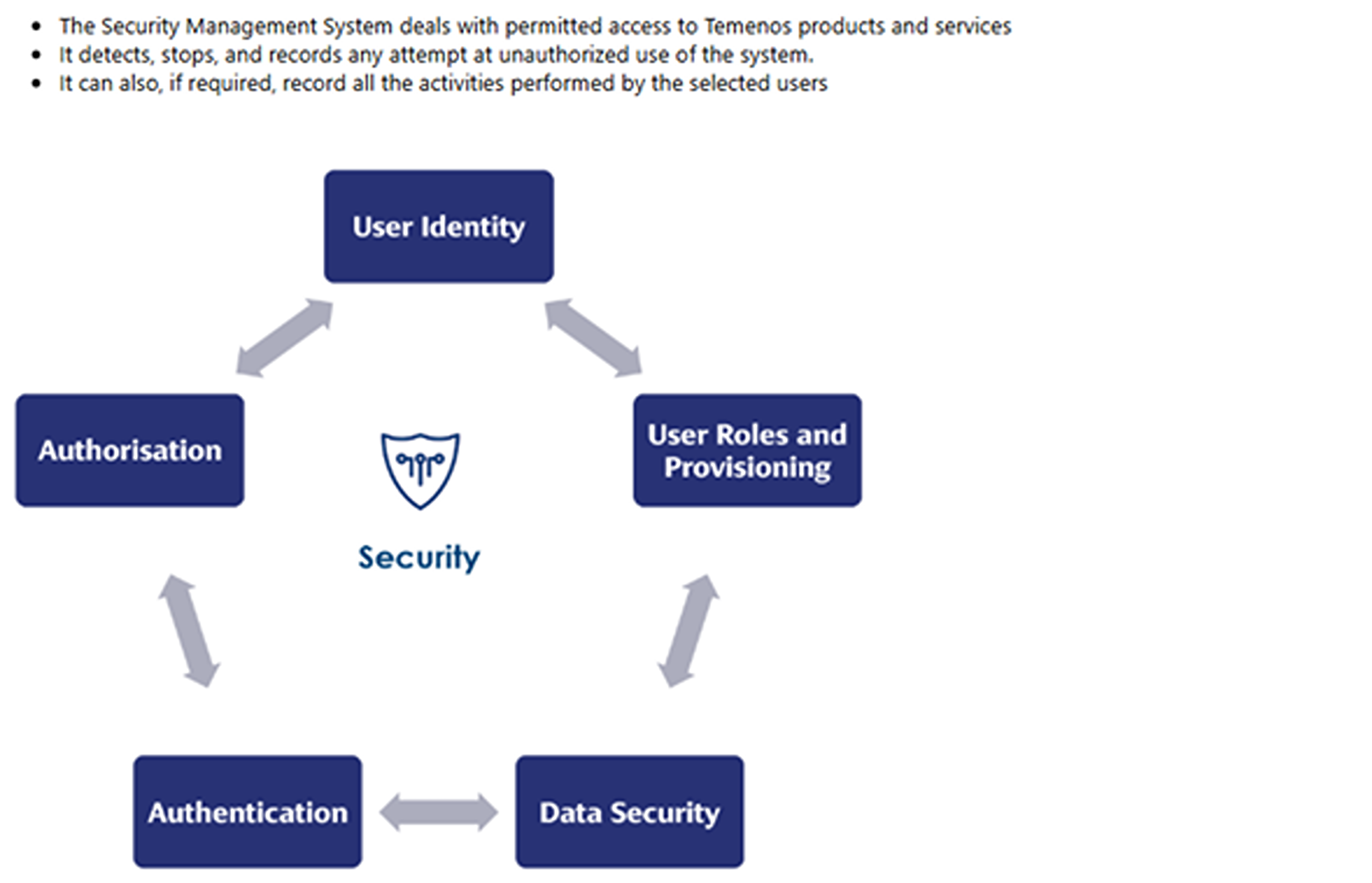 Temenos Security Framework proporciona identificación, autenticación y control de acceso seguros y consistentes en todas las soluciones y servicios de Temenos basados en estándares abiertos de la industria.