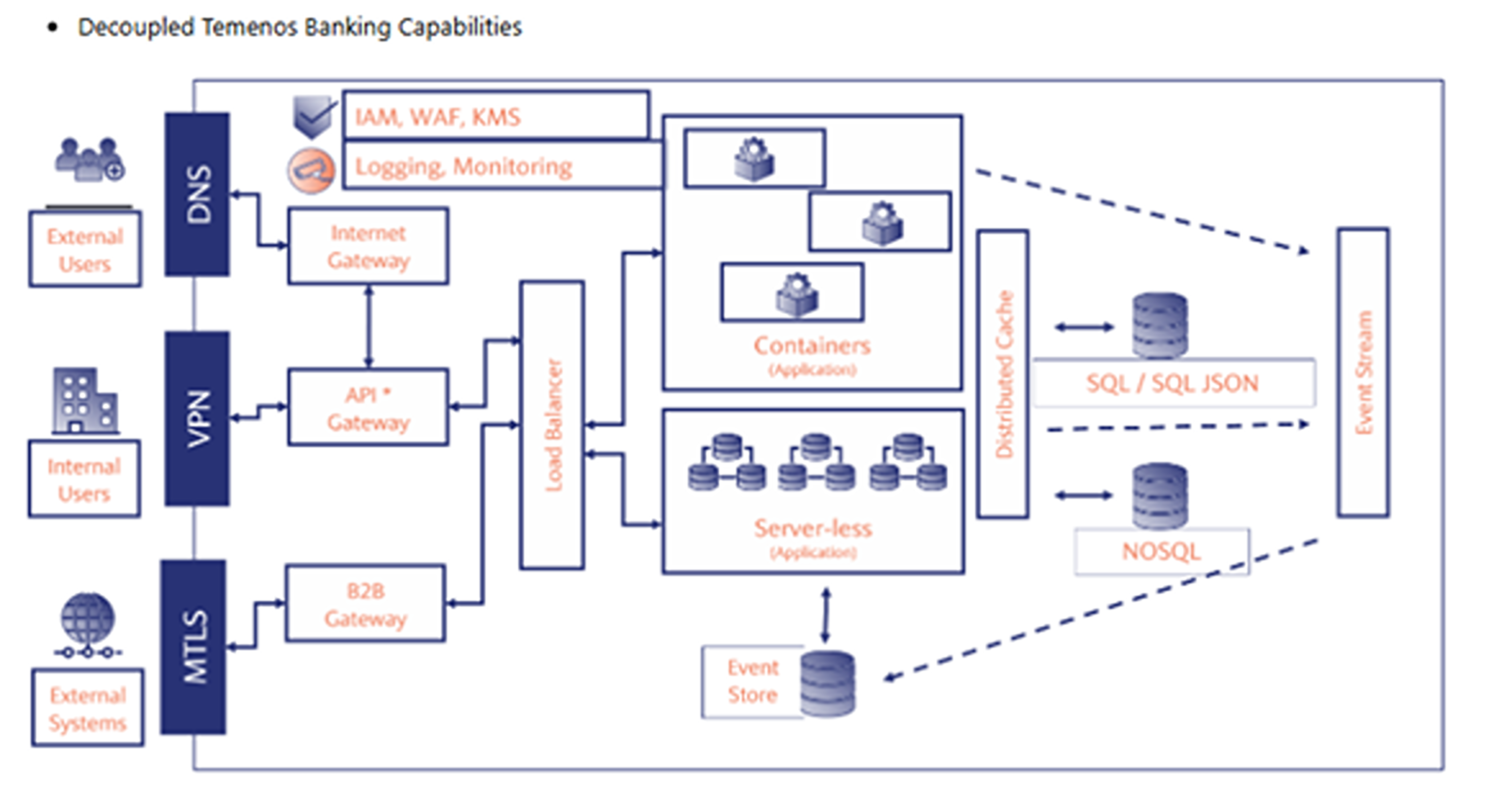 La arquitectura representada destaca un sistema seguro y escalable que integra múltiples capas para administrar las solicitudes de usuarios externos, usuarios internos y sistemas externos.